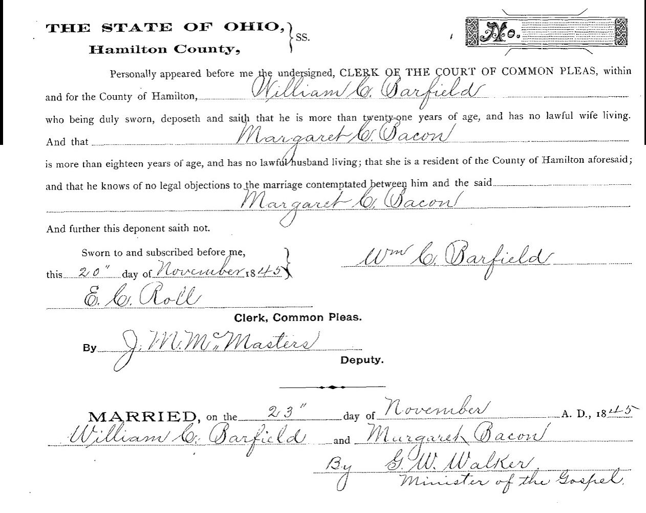 Marriage Record - BARFIELD, Wm & BACON, Margaret 1845 Hamilton Co Ohio