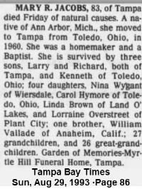 Linda Lou Jacobs was mentioned in the obituary of published on 29 August 1993 in Tampa Tribune, Tampa, Hillsbourgh, Florida, USA.2