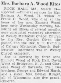 - [S1185] "Newspaper Article", The obituary of Barbara A. Wood, 74, who lived in ROCK HALL, Md., was published on page Page 22 of the Wilmington, Delaware The News Journal on 24 March 1951. Source: 24 Mar 1951, Page 22 - The News Journal at Newspapers.com URL: https://www.newspapers.com/image/161914982/,0.84545815,0.39086378,0.96846247&xid=3355.