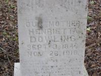 From A Dowling Family of the South - Some forty years after husband Oliver Perry DOWLING passed away, Henrietta died on November 20, 1918. The sons she had so lovingly reared buried her in the most luxurious casket that could be bought! She and OLIVER PERRY are in the Dowling Cemetery, near Brunson, South Carolina. Henrietta had been born September 3, 1848.3 She was buried after 26 November 1918 at Dowling Cemetery, Burnson, Hampton, South Carolina, USA.5