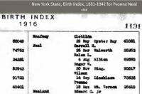- [S1241] Yvonne Neal, NY State Birth Index, 1881-1942 p 1191, NY State Birth Index, 1881-1942 for 1916 p 1191, Neal, Yvonne