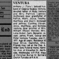 Antonio Joseph Ventura was mentioned in the obituary of published on 22 June 1977 in Cincinnati Enquirer, Cincinnati, Hamilton, Ohio, USA.11