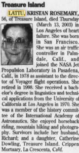 Kristan Rosemary Lattu was mentioned in the obituary of published on 24 March 2003 in St. Petersburg Times page 109, Saint Petersburg, Pinellas, Florida, USA.2