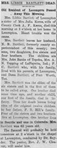 Obituary - Bartlett, Libbie (Hill) 1843-1908 Kansas in Lawrence Weekly World Kansas