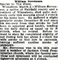 - [S754] Find-a-Grave, online http://www.findagrave.com, Find a Grave, database and images (https://www.findagrave.com/memorial/49746245/… accessed 08 December 2021), memorial page for William Samuel Stevenson (15 Jan 1853–2 Mar 1910), Find a Grave Memorial ID 49746245, citing Lebanon Presbyterian Church Cemetery, Lebanon, Fairfield County, South Carolina, USA; Maintained by Linda Ullom Buchanan (contributor 46931949).