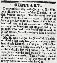 Departed this life, on the 24th ult. [24 Feb. 1844] Mr. William Howle, Senr., of this District, in the 89th year of his age. The deceased was one of those who took an active part, during the time of the Revolution, in favor of this his native land, and had the consolation of living to see the great blessings that are enjoyed by the millions, who, had it not been for him and his fellow patriots, would now have been under the British yoke.