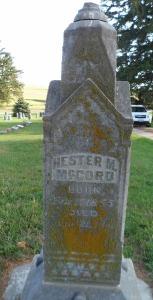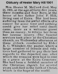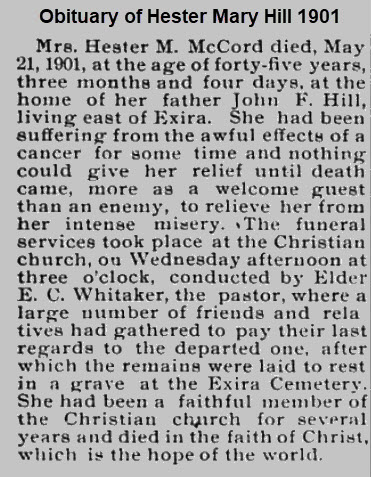 Exira, May 24, - Special: Mrs. Hester A. McCord, a daughter of Mr. and Mrs. J. F. Hill, residing a short way east of town, who had long suffered an incurable cancer, was relived of her misery by death. Elder Whitaker, of the Christian Church, said comforting words to the sorrowing ones, and the body was laid away in the Exira cemetery."
